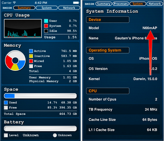 - Để kiểm tra thông tin về chip A9, bạn hãy cài đặt ứng dụng Lirium Device Info Lite (https://goo.gl/obcjXH) hoặc Battery Memory System Status Monitor (https://goo.gl/IrJxCG). Chip do Samsung sản xuất sẽ có model là N66AP hoặc N71AP, ngược lại của TSMC sẽ là N71mAP hoặc N66mAP.