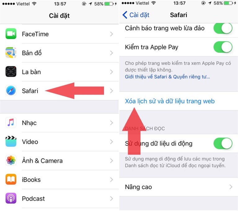 - Mở Cài đặt > Safari > Xóa lịch sử và dữ liệu duyệt web.