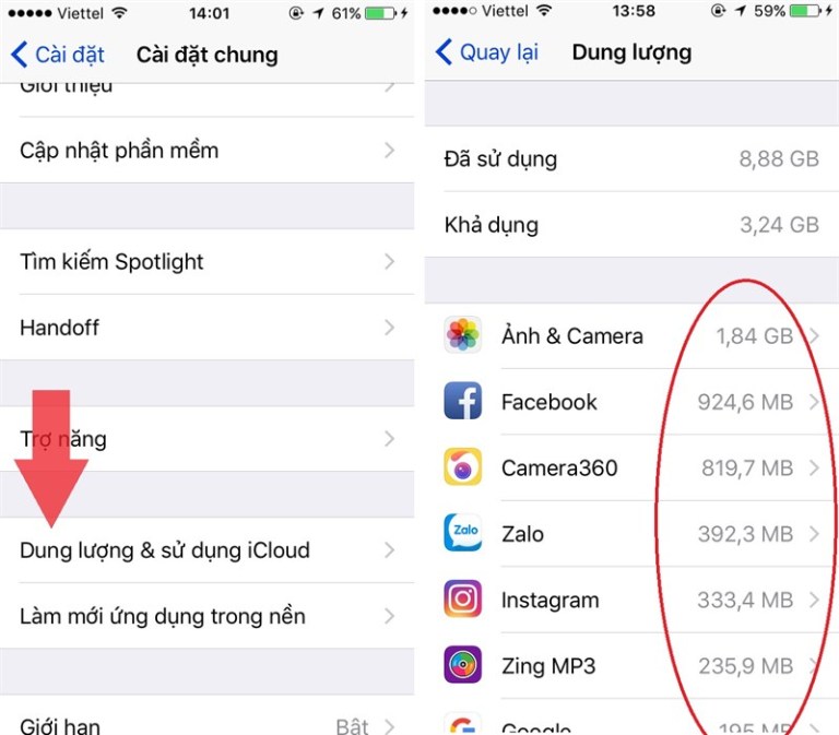 - Cài đặt > Cài đặt chung > Dung lượng & sử dụng iCloud > Quản lý dung lượng > Kiểm tra dữ liệu ứng dụng nào phình to bất thường và xóa.