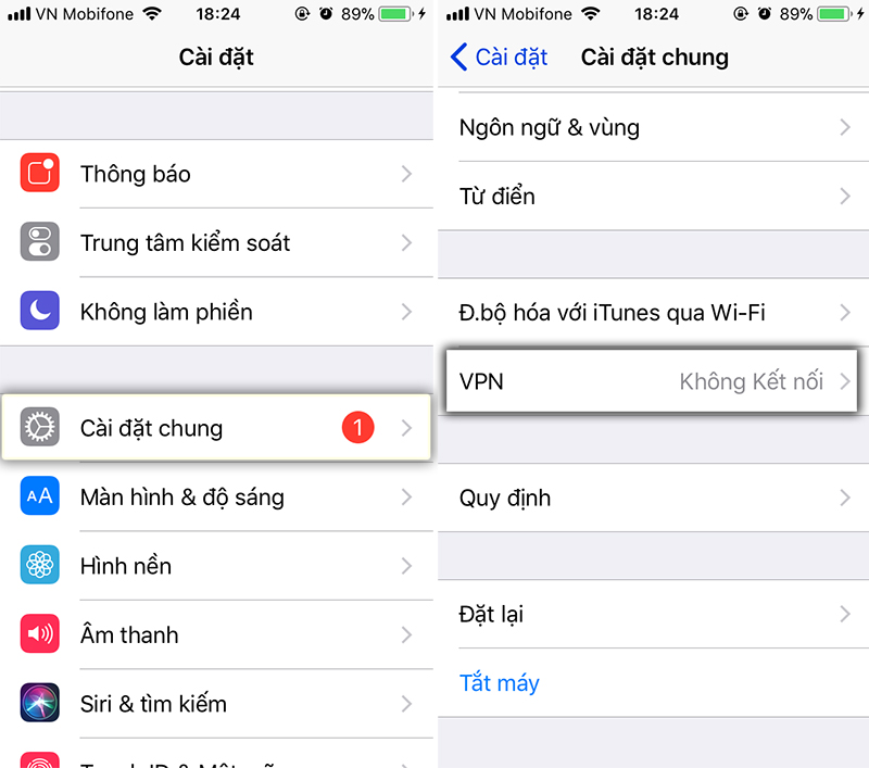 - Cài đặt > Cài đặt chung > VPN > Kiểm tra và gạt thanh điều khiển về OFF để tắt tính năng VPN.