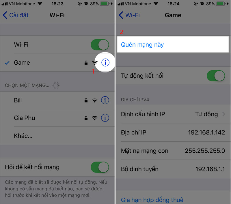- Cài đặt > Wi-Fi > Nhấn vào biểu tượng "i" bên phải tên Wi-Fi > Quên mạng này > Tiến hành kết nối lại bằng cách nhập mật khẩu Wi-Fi của mạng tương ứng.