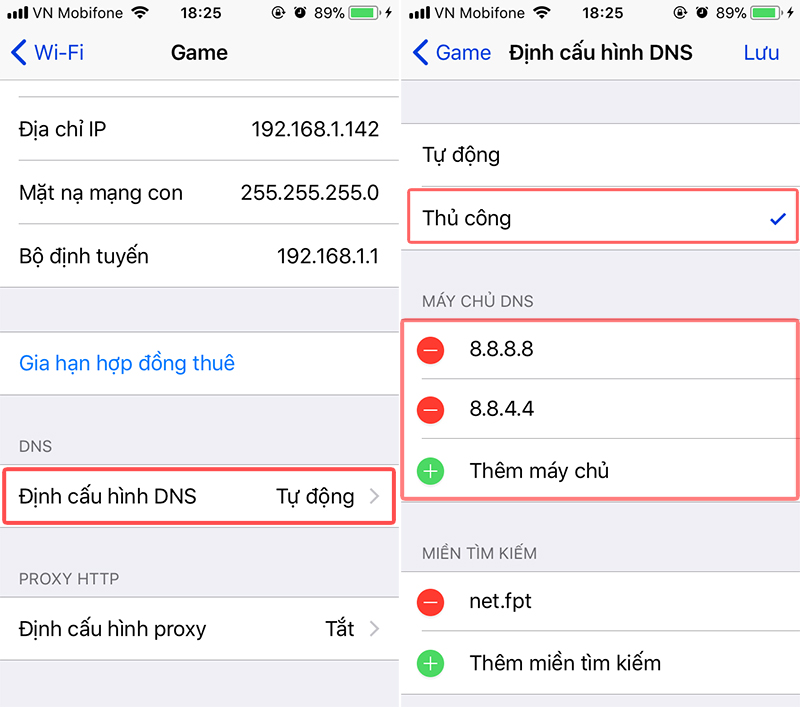 Cài đặt > Wi-Fi > Nhấp vào tên Wi-Fi mình đang dùng > Định cấu hình DNS > Check vào Thủ công và tiến hành thêm vào 2 máy chủ sau đây: