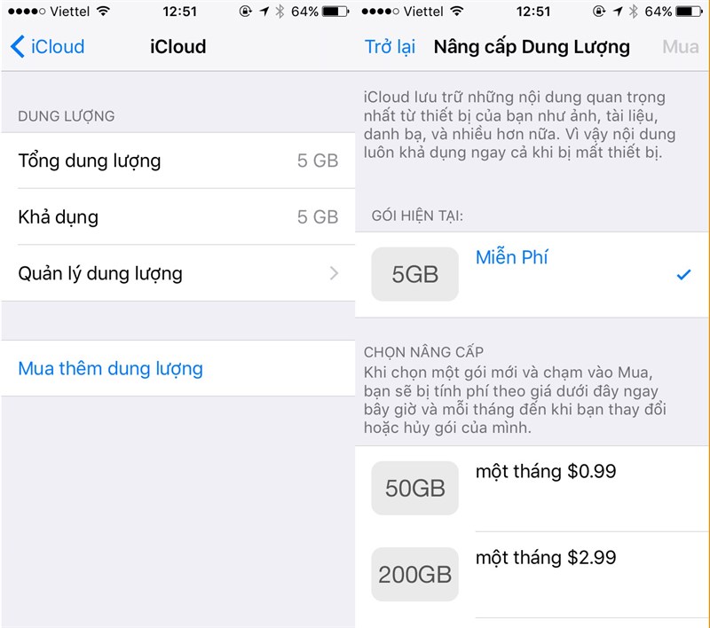 Bạn sử dụng đến công cụ iCloud, đám mây của Apple cho phép người dùng sử dụng miễn phí 5GB, hoặc bạn có thể mua thêm dung lượng lên tới 2TB.