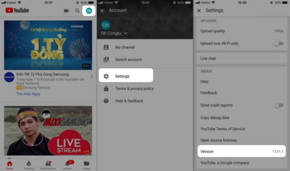 Bước 2: Nếu không tìm thấy có thể iPhone, iPad của bạn đã tự động cập nhật. Bạn hãy kiểm tra phiên bản YouTube bằng cách hãy nhấn vào biểu tượng ảnh đại diện của bạn ở góc trên cùng bên phải của YouTube dành cho iOS. Sau đó chọn tùy chọn Settings (Cài đặt) từ trình đơn và kéo xuống dưới cùng. Phiên bản trên 13.01.4 là được.