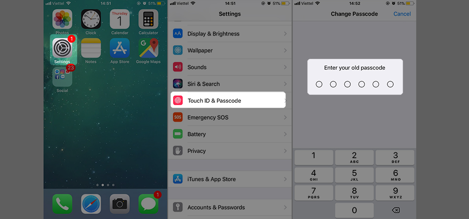 Bước 1: Đầu tiên, từ màn hình khóa bạn hãy truy cập vào Settings > Touch ID & Passcode. Bạn hãy nhập Passcode 6 số hiện tại.