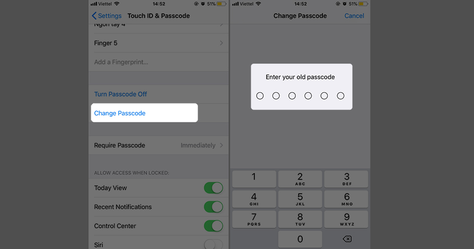 Bước 2: Chọn vào Change Passcode, sau đó tiến hành nhập lại mật khẩu 6 số lần nữa.