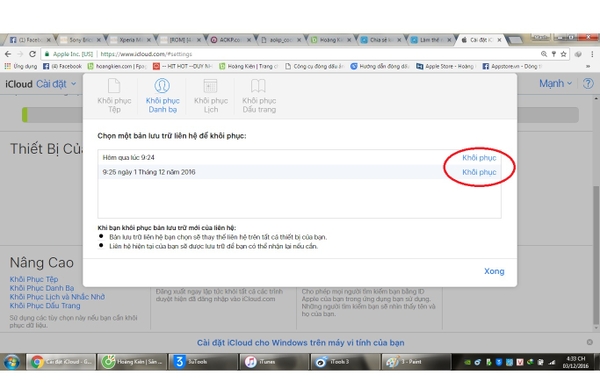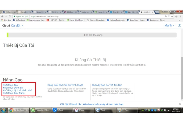 Bước 3. Tại trang Cài đặt iCloud, kéo xuống dưới và click vào đường link “Khôi phục ” (Restore )