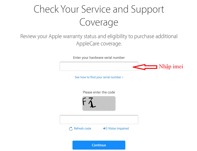 – Kiểm tra xem máy còn bảo hành hay không: Các bạn truy cập địa chỉ: https://checkcoverage.apple.com/vn/en/ và nhập IMEI của máy để check bảo hành của Apple
