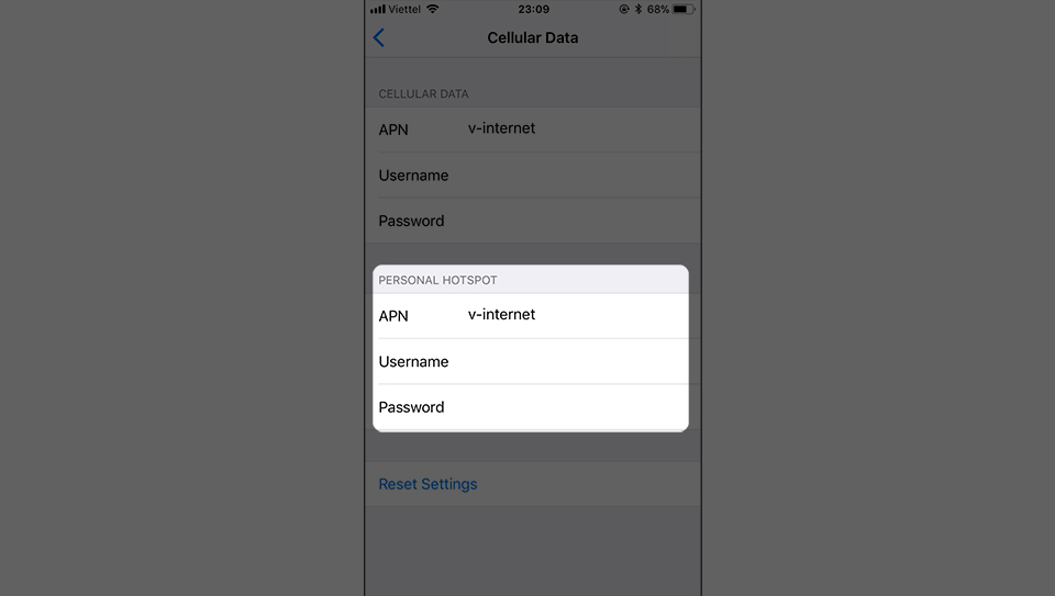 - Viettel: APN: v-internet , Username: (để trống) , Password: (để trống)