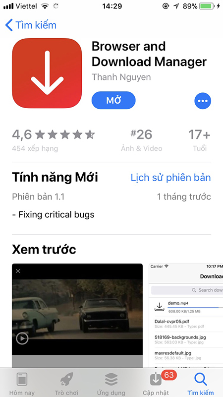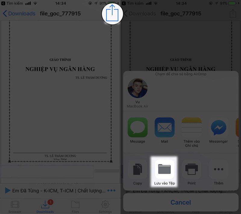 Tệp tin tải về sẽ được hiển thị trong tab Downloads của ứng dụng. Để lưu về iPhone, bạn chọn một file đã tải về bất kỳ, sau đó chọn nút chia sẻ và Lưu vào Tệp.