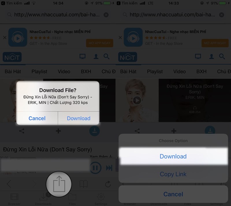 Chọn một bài hát bất kỳ, ngay khi bài hát được phát lên, ứng dụng sẽ bắt link tải về cho người dùng. Mình chọn Download. Trong trường hợp ứng dụng không tự động bắt link cho bạn, hãy chọn nút chia sẻ bên dưới, chọn tiếp Download.