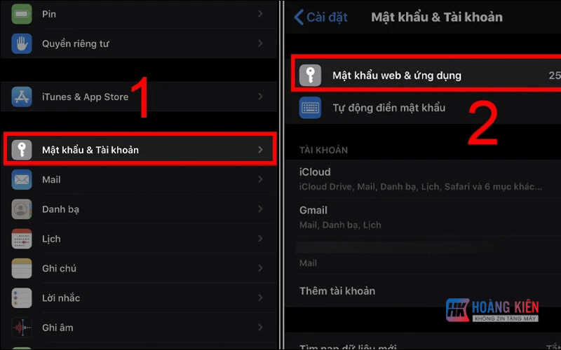 Trên điện thoại, mở cài đặt và chọn mục Mật khẩu & Tài khoản, sau đó chọn Mật khẩu web & ứng dụng.