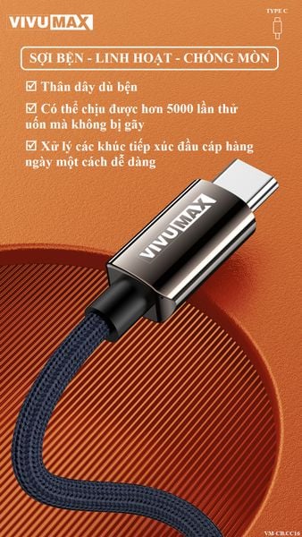 Cáp sạc nhanh dây bện dù đầu hợp kim kẽm 5A Vivumax CC16 Type C to Type C 66W đã giải quyết cơ bản vấn đề về tiếp xúc đầu cáp và dây bị hỏng, gãy nứt. Và với đầu cáp làm bằng hợp kim kẽm cải thiện độ bền tiếp xúc, nói lời tạm biệt với vết nứt tiếp xúc giữa đầu cáp và dây.