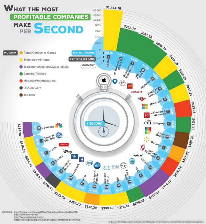 Lợi nhuận 2016 của các công ty trong danh sách được lấy từ bảng xếp hạng Fortune 500. Dựa trên số liệu đó, TitleMax đã tổng hợp lại đưới dạng biểu đồ infographic về những công ty kiếm được nhiều tiền nhất mỗi giây.