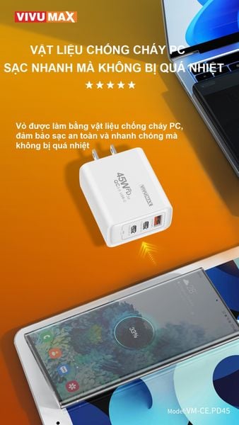 Vật liệu: Củ sạc 3 cổng Vivumax PD45 45W với vỏ được làm bằng vật liệu PC chống cháy, chắc chắn, bền bỉ và an toàn hơn