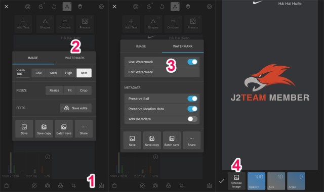 Nếu sử icon hoặc logo thì các bạn cần kích hoạt Watermark (nhấn vào biểu tượng ô vuông ở góc dưới bên phải màn hình) > chuyển sang tab Watermark > bật Use Watermark và nhấn vào dòng Edit Watermark để chọn icon hoặc logo cần dùng.