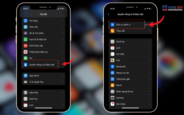 Bước 1: Bạn truy cập vào phần Cài đặt trong điện thoại, chọn mục Quyền riêng tư và nhấn mở Dịch vụ định vị. truy cập phần cài đặt