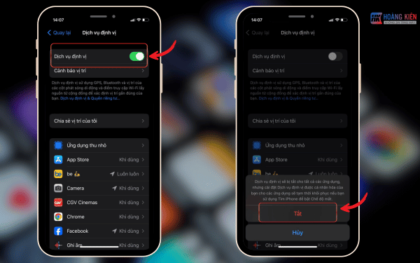 Bước 2: Trong phần Dịch vụ định vị, bạn gạt thanh trượt phía cuối sang bên trái hiển thị màu xám để Tắt tính năng này. Bạn nhấn xác nhận Tắt một lần nữa để hoàn tất thao tác.