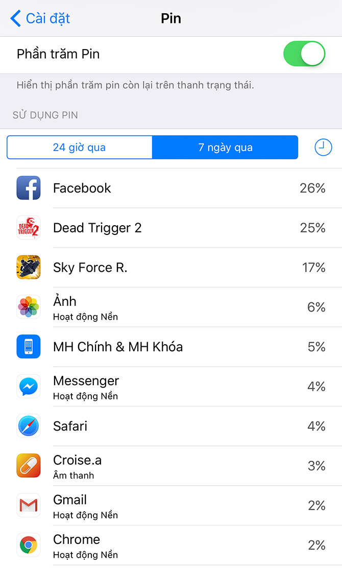 Đây là việc cần làm đầu tiên để biết được những ứng dụng nào đang ngốn pin nhiều nhất. Có thể có một số ứng dụng ngốn pin bất thường mà bạn không hề hay biết. Vào Cài đặt -> Pin, tìm đến mục "Sử dụng pin" để kiểm tra xem những ứng dụng nào đang ngốn pin nhiều trong 24 giờ hoặc trong cả tuần qua.