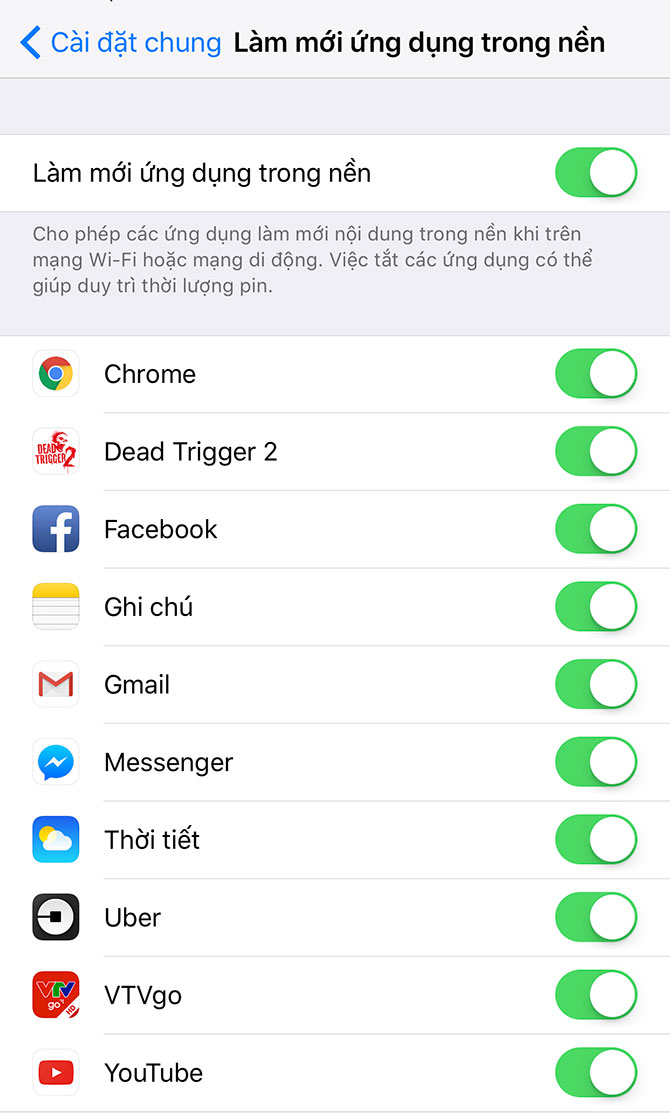 Ở mục Cài đặt, tìm đến phần Cài đặt chung -> Làm mới ứng dụng chạy nền. Ở đó, bạn có thể thấy những ứng dụng đang ngốn pin của điện thoại khi không sử dụng. Rất nhiều ứng dụng chiếm quyền điều khiển Wi-Fi để cập nhật nội dung khi chúng hoạt động ở chế độ nền. Để tiết kiệm pin, bạn có thể tắt chế độ làm mới ứng dụng trong nền ở hầu hết ứng dụng, chỉ để lại những ứng dụng thật sự cần thiết, quan trọng.