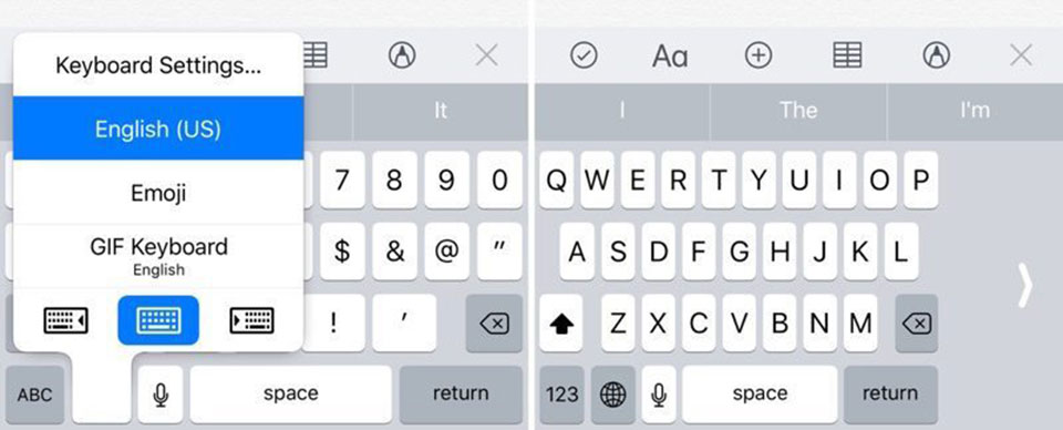 Đây là một tính năng tiện dụng để bạn dễ dàng sử dụng những thiết bị iOS có màn hình lớn (iPhone phiên bản Plus hoặc iPad). Bấm và giữ nút biểu tượng cảm xúc trên bàn phím để lựa chọn việc chuyển đổi bàn phím thu gọn lại cho tay thuận (trái hoặc phải). Khi bạn muốn quay trở lại chế độ bàn phím ban đầu để sử dụng 2 tay thì chọn sang mục tiêu chuẩn.