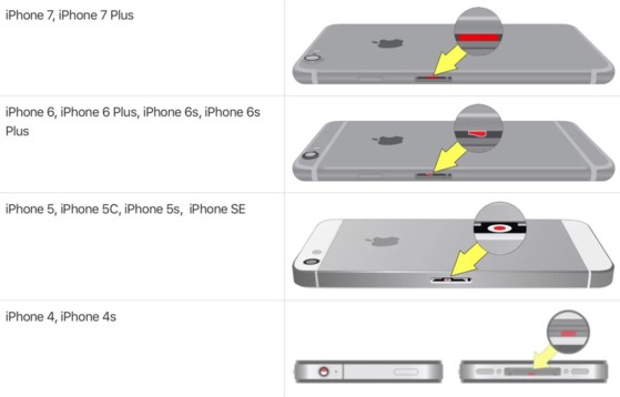 - iPhone 5, 5S, 6, 6S, 7, 7 Plus: Nếu chấm trắng bên trong khe cắm SIM chuyển thành màu đỏ thì thiết bị đã vô nước.