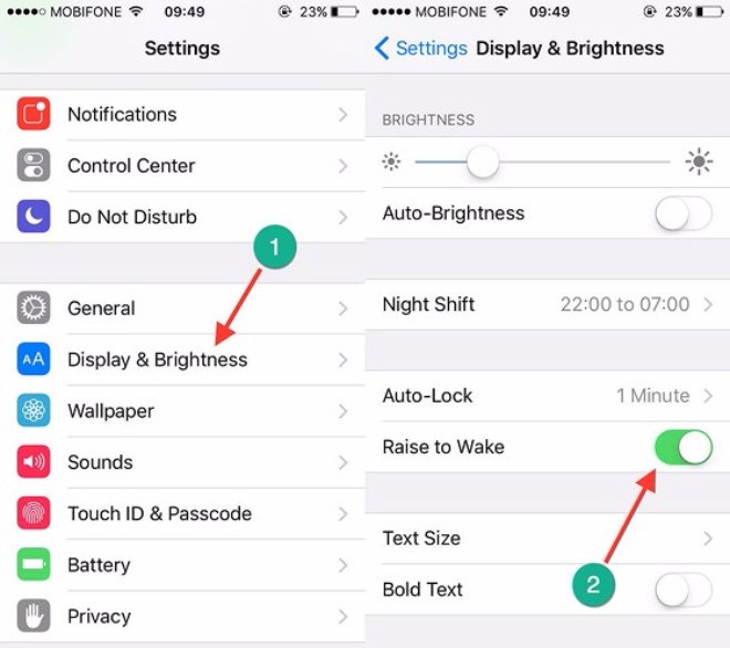 Kể từ iOS 10, Apple đã bổ sung thêm tính năng Raise to wake, cho phép thiết bị tự động sáng màn hình khi người dùng cầm iPhone. Nếu lo ngại tốn pin, bạn có thể truy cập vào Settings (cài đặt) > Display & Brightness (hiển thị và độ sáng) và vô hiệu hóa tùy chọn Raise to wake. Lưu ý, tính năng này chỉ hoạt động trên một số thiết bị đời mới gồm iPhone 6S, iPhone SE… hoặc cao hơn.