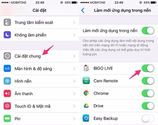 Mặc định, mỗi khi cài đặt ứng dụng mới, tính năng Background App Refresh sẽ được tự động kích hoạt nhằm giúp bạn không bỏ lỡ các thông báo quan trọng. Tuy nhiên, đây cũng chính là nguyên nhân khiến iPhone hết pin nhanh hơn. Để thay đổi, bạn hãy vào Settings (cài đặt) > General (cài đặt chung) > Background App Refresh (làm mới ứng dụng trong nền), sau đó tắt bớt các ứng dụng không cần thiết.