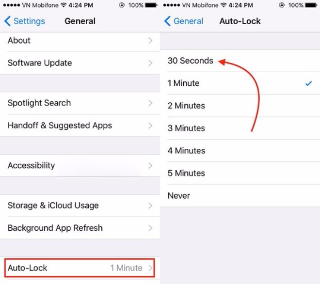 Độ sáng màn hình chính là yếu tố “ngốn” pin hàng đầu trên smartphone. Do đó, bạn nên rút ngắn thời gian tự động khóa màn hình bằng cách vào Settings (cài đặt) > Display & Brightness (hiển thị và độ sáng) > Auto-Lock (tự động khóa) và chọn mốc thời gian tương ứng như 30 giây, 1 phút… Nếu đang sử dụng iOS 11, người dùng chỉ cần vào Settings (cài đặt) > General (cài đặt chung) > Auto-Lock (tự động khóa).