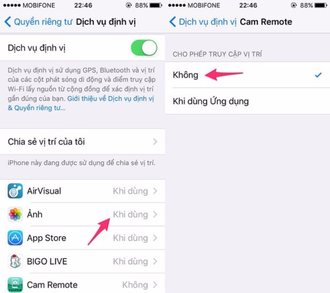 Đầu tiên, bạn hãy vào mục Settings (cài đặt) > Privacy (quyền riêng tư) > Location Services (dịch vụ định vị). Tại đây sẽ bao gồm danh sách các ứng dụng có quyền truy cập vào vị trí của bạn, nếu cảm thấy không cần thiết, bạn có thể thay đổi thành Never (không).