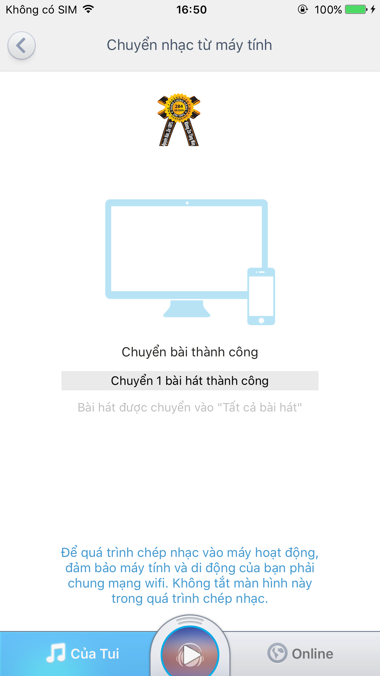 Đầu tiên các bạn cần tải ứng dụng NHACCUATUI trên Apple store ở iPhone,iPad,sau khi tải xong các bạn mở ứng dụng ra và để ý có mục CỦA TUI,các bạn chọn vào đó và kéo xuống sẽ có một dòng là Chuyển nhạc từ máy tính thì các bạn chọn tiếp vào đó.