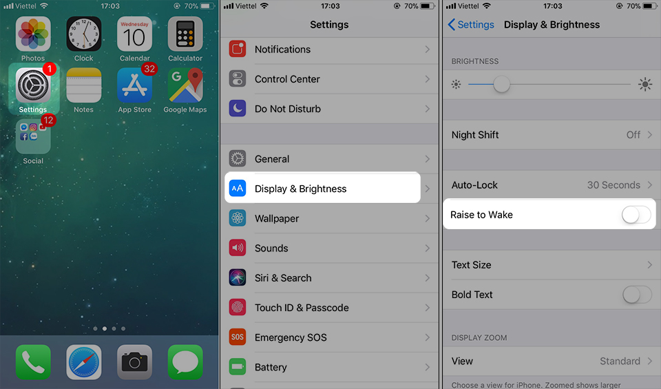 Để tắt tính năng này bạn hãy truy cập: Settings > Display & Brightness > Ở mục “Raise to Wake” gạt sang trái để tắt.