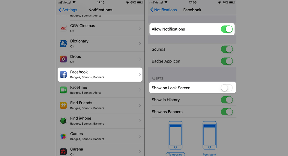 Hãy kéo xuống dưới tìm những ứng dụng không cần thiết, ở đây mình chọn Facebook. Ở mục “Show on Lock Screen”, hãy gạt sang trái để tắt nó đi. Còn nếu bạn muốn tắt luôn tất cả từ âm thanh báo đến báo trên màn hình khóa thì tắt mục “Allow Notifications” ở trên cùng.