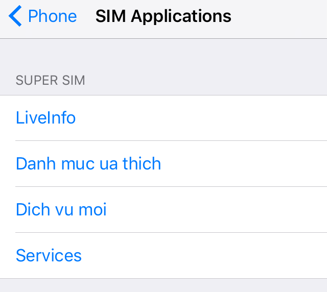 Nếu có những dịch vụ viết bằng tiếng Việt của nhà mạng, hoặc trong phần cài đặt Điện thoại không có phần "Ứng dụng SIM", chuyển sang Bước 3 để tiếp tục kiểm tra.