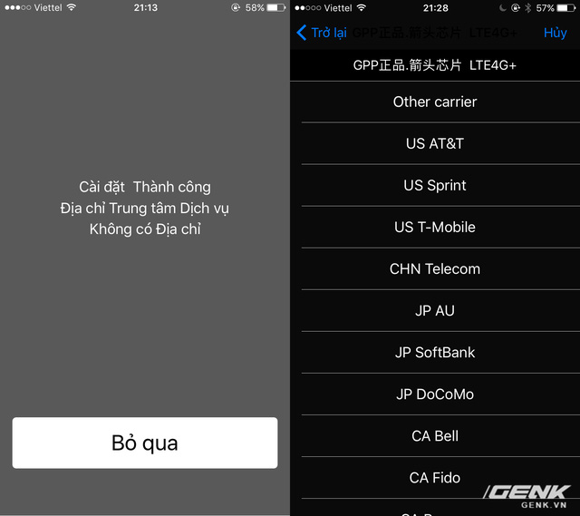 - Nếu bảng chọn nhà mạng hiện ra thì đây chắc chắn là máy lock (ảnh bên phải).