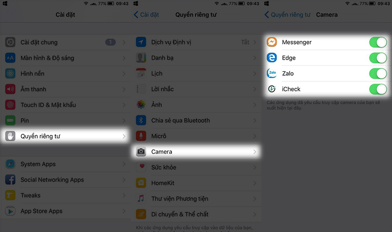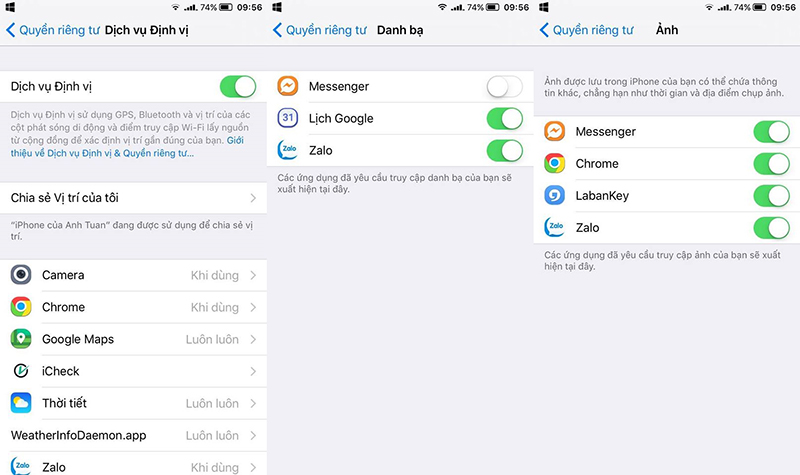 Bằng cách truy cập Cài đặt > Quyền riêng tư > Dịch vụ định vị/Danh bạ/Ảnh/Micro/... > Tắt đi những ứng dụng mà bạn không muốn cho truy cập những quyền trên.