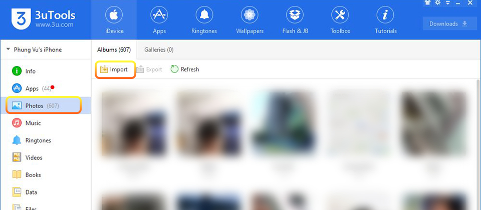 Sau khi cài đặt 3uTools xong, bạn tiến hành kết nối iPhone với máy tính. Mở phần mềm 3uTools lên và chọnPhotos > Import. Sau đó chọn 8 hình nền động mà ta đã tải về ở bước 1.