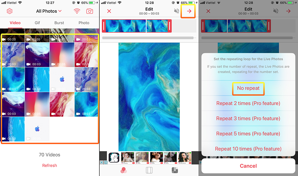 Bây giờ bạn hãy chọn một trong 8 hình động mới copy vào và chọn hình mũi tên ở góc trên cùng bên phải. Bảng mới hiện ra cho phép chúng ta chọn No Repeat. Xong bạn ấn Save Live Photos để lưu lại.
