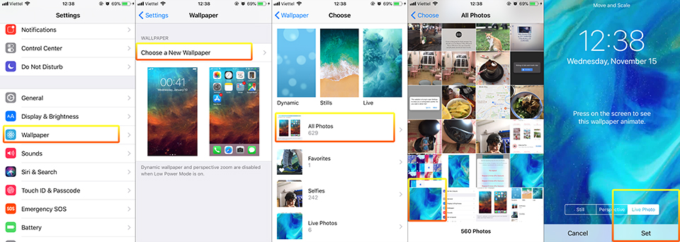 Bước 5: Tiến hành đổi hình nền bằng cách vào Settings > Wallpaper > Choose a New Wallpaper > All Photos > Chọn ảnh mới lưu > Chọn Live Photo và ấn Set để đổi.