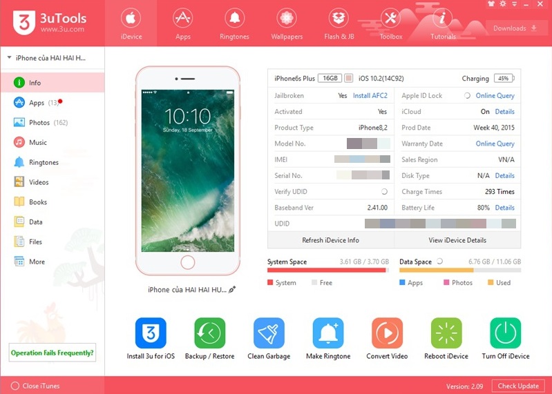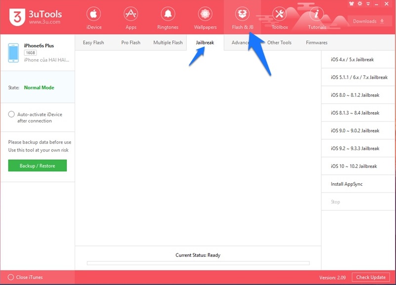 Bước 1: Tải về và cài đặt 3uTools V2.09 > Kết nối iDevice của bạn vào máy tính của bạn và chọn tab "Flash & JB" > "Jailbreak".