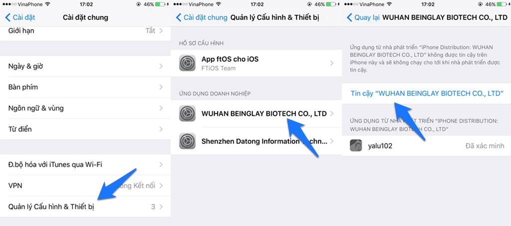 Bước 4: Để công cụ này hoạt động trên thiết bị của bạn, bạn cần truy cập "Cài đặt" > Cài đặt chung > Quản lý thiết bị và nhấn tin cậy nhà cung cấp.