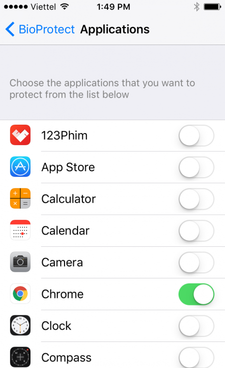 Để khóa ứng dụng, bạn vào Settings > BioProtect > Applications. Một bảng danh sách liệt kê các ứng dụng có trong máy. Bạn chỉ cần bật mục ứng dụng đó qua màu xanh là tương ứng với ứng dụng đó, chẳng hạn dưới đây mình khóa thử ứng dụng Chrome.
