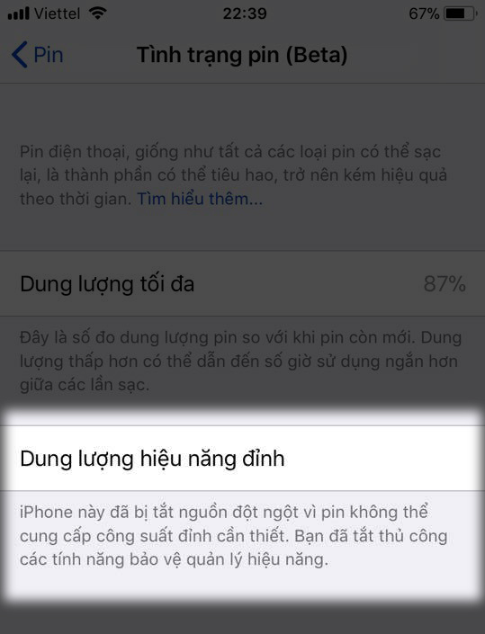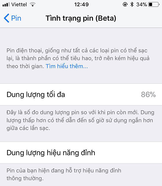 Bạn sẽ biết Dung lượng Pin tối đa cũng như nhận được một thông báo: "Pin của bạn hiện đang hỗ trợ hiệu năng đỉnh thông thường". Với thông báo này, bạn có thể yên tâm rằng điện thoại của bạn có thể sử dụng với hiệu năng như máy mới, và sẽ không cần phải tắt chế độ giảm hiệu năng.