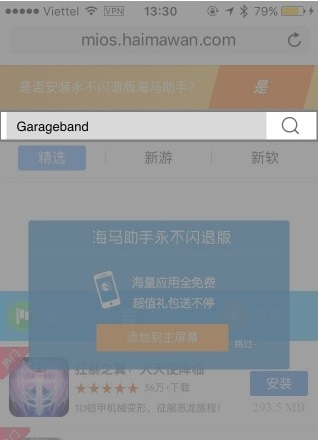 - Mở Safari > Vào http://mios.haimawan.com/ sau đó bạn sẽ điền vào khung tìm kiếm ứng dụng mà bạn muốn tải, sau đó, bạn sẽ tìm biểu tượng tìm kiếm để tìm. Khi này, bạn sẽ nhìn thấy trang kết quả xuất hiện, bạn chỉ cần tìm ứng dụng mà muốn tải và chọn vào ô màu xanh. Ở đây mình sẽ tìm kiếm app "Garageband".