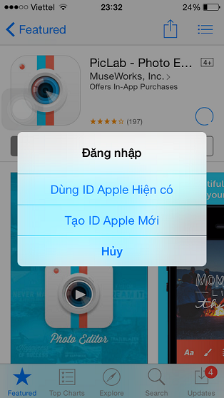 Lưu ý: các bạn chắc chắn là không có 1 ID nào đăng nhập vào Appstore trong setting trên iDevices của các bạn. Nếu có thì các bạn vào Cài đặt => iTunes & App Stores: Nếu đã có ID đăng nhập thì bạn Sign Out ra.