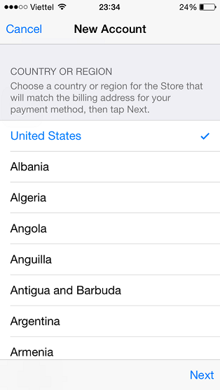 Bước 3: chọn vùng Quốc gia mong muốn (ở đây mình hướng dẫn là Store US nên các bạn chọn mục "United States" > Next