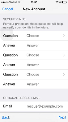 Bước 5: điền Mail, Password, Câu hỏi bảo mật, Sinh nhật của bạn vào các mục > "Next" (Lưu ý: PW gồm ít nhất 8 kí tự gồm chữ cái và số, có kí tự viết hoa)