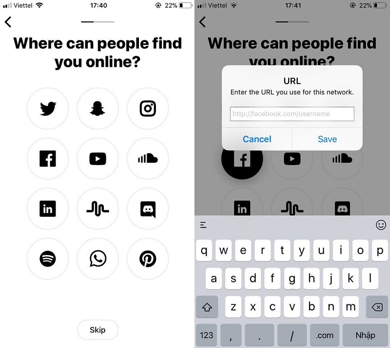 Bước 3: Trang này sẽ giúp bạn để lại địa chỉ các mạng xã hội, ứng dụng phổ biến như: Facebook, Youtube, Snapchat,...