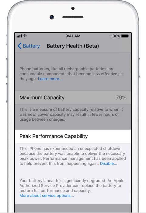 Nên lưu ý: tình trạng pin chai quá nhiều (chỉ còn dùng được khoảng 80% dung lượng thực) sẽ có một thông báo dài hơn. Ngoài ra trong trường hợp nếu máy tắt nguồn đột ngột, chế độ giảm hiệu năng sẽ tự bật trở lại để đảm bảo khả năng hoạt động của iPhone