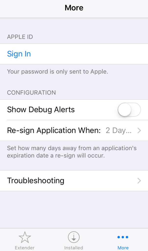 Bước 3: Bên trong ứng dụng Extender, bạn mở đến trang ‘More’ và chắc chắn rằng bạn đang đăng nhập bằng Apple ID của mình. Nếu không, hãy chọn vào ‘Sign In’ và đăng nhập bằng Apple ID của bạn. Mặc dù việc đăng nhập Apple ID chỉ dùng để đăng kí chứng chỉ tới Apple nhưng mình vẫn khuyên các bạn nên sử dụng một Apple ID phụ.
